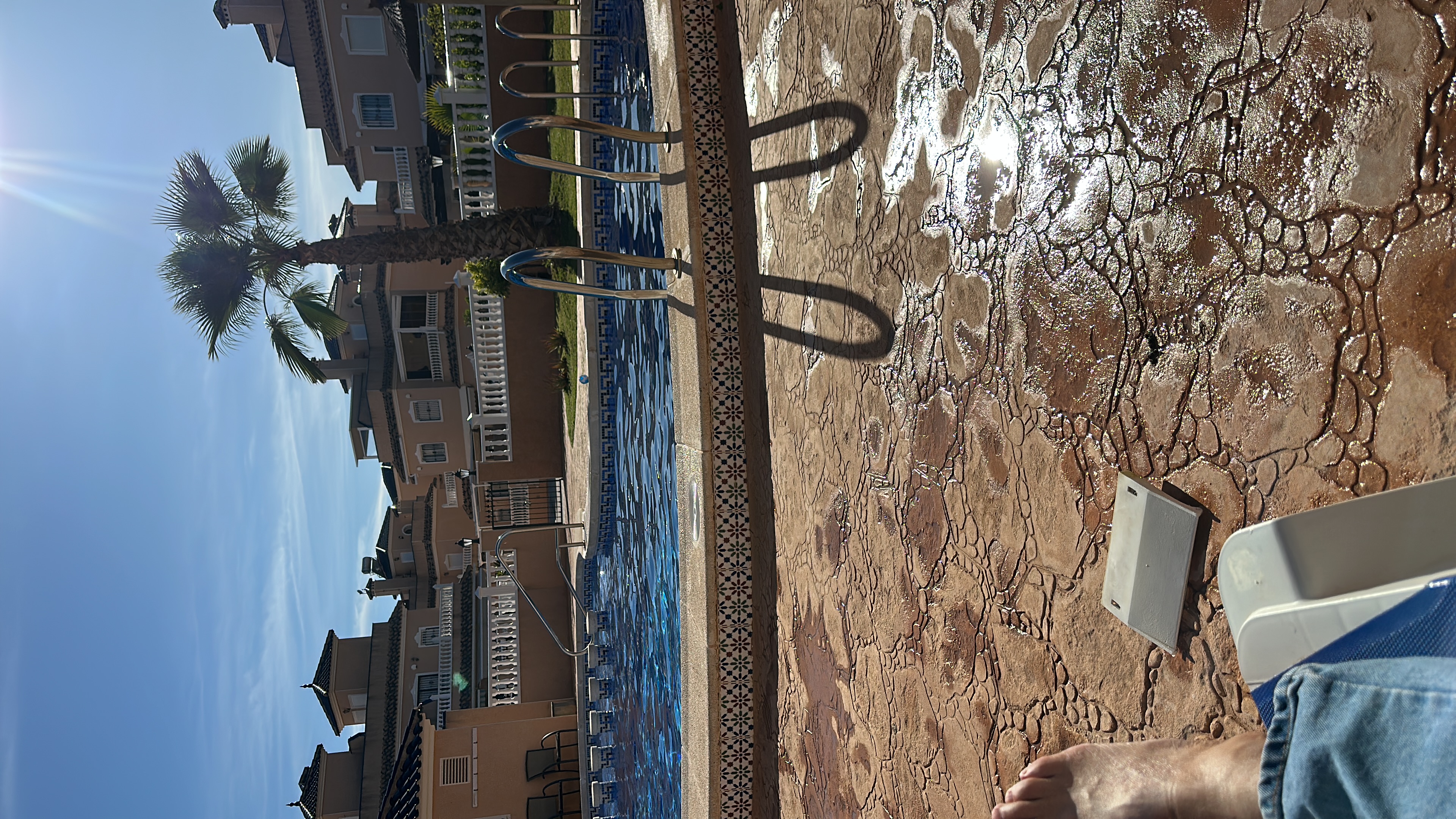 2 bedrooms and two bathrooms with a community pool about 15 seconds walk from our gate, we have a sea view from the solarium with table and loungers here. The patio has sun from early morning, enjoy breakfast on the patio